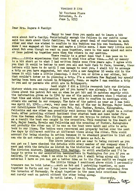 feiten te vertellen over het sneuvelen van Robert, die bij hen op dat moment nog niet bekend zijn. Als Utz niet gewond was geraakt in Bastogne was hij er die betreffende nacht op de Rijn wellicht bij geweest…